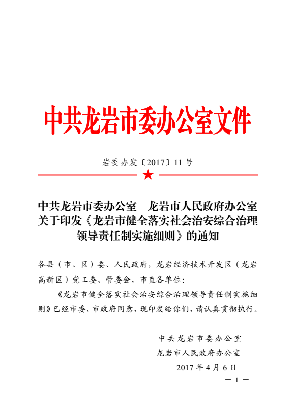 龍巖市健全落實(shí)社會(huì)治安綜合治理領(lǐng)導(dǎo)責(zé)任制實(shí)施細(xì)則(巖委辦發(fā)【2017】11號(hào))