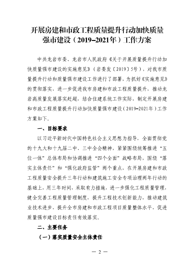 龍巖市住房和城鄉(xiāng)建設(shè)局關(guān)于印發(fā)開展房建和市政工程質(zhì)量提升行動加快質(zhì)量強市建設(shè)(2019-2021年)工作方案的通知